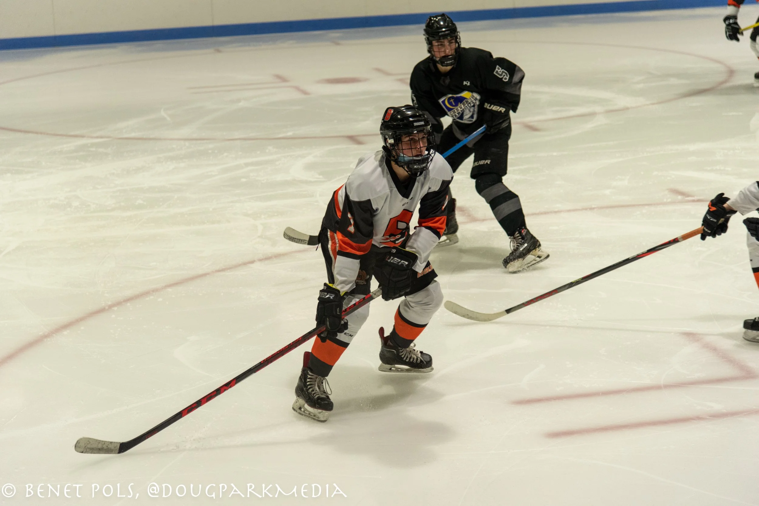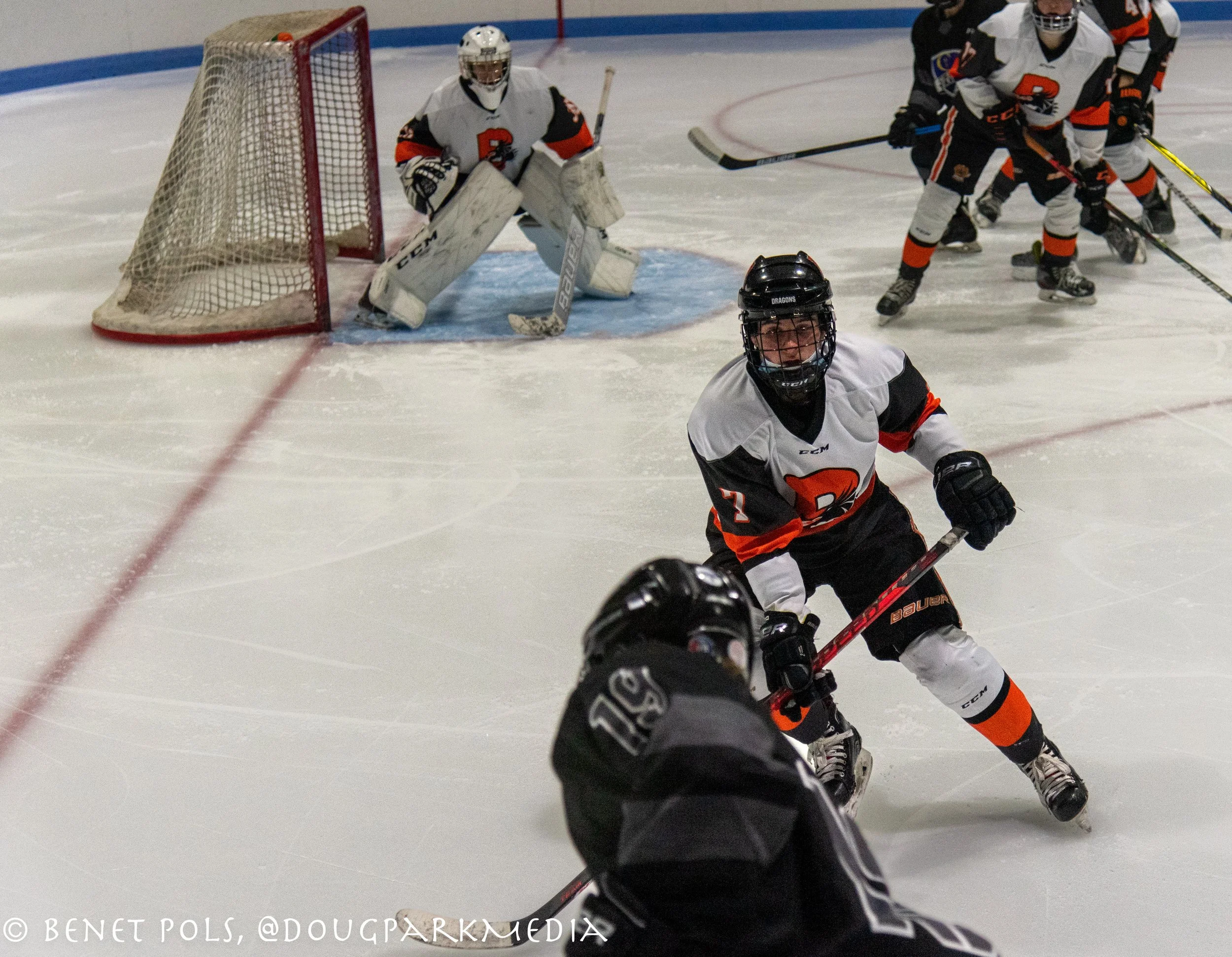A third look at this set of photographs after publishing them in a game album last week revealed a second layer of detail: one of those little bits of dutiful hard work and attention to detail that define teamwork, the back-check. My theme had been the eyes of the defenseman as he worked to contain the puck carrier at the corner; it seemed like a candidate for Faces of Brunswick.