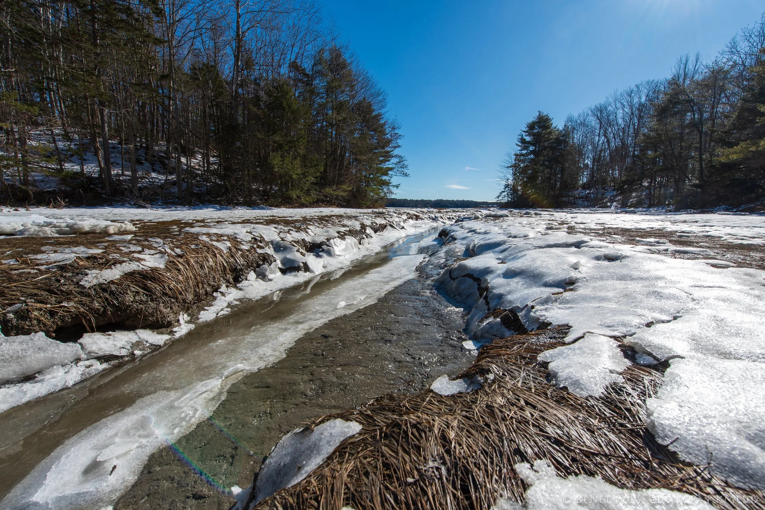 A great example of this is the path at the Maquoit Conservation Land . With just a straight out and back and little fresh snow to rejuvenate the path the footing leads to a mincing pantomime of a penguin. One solution, if you’re up for it, is to do a little bushwhacking, and get down to the adjacent stream beds.